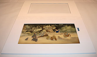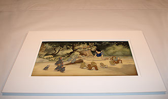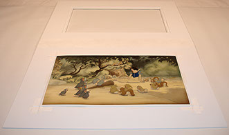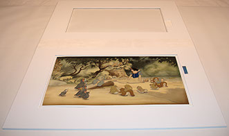 A proper housing for animation art presents its own unique challenges, due to the self destructive nature of the materials involved. There are not many simple answers or many generic solutions. Often each piece presents its own set of problems. The mediums vary from production to production. The history of how the art was previously cared for also affects the piece. As long as that is the case, specific care will always be the educated alternative for those seeking something more elaborate than a generic mat provided by a frame shop.
