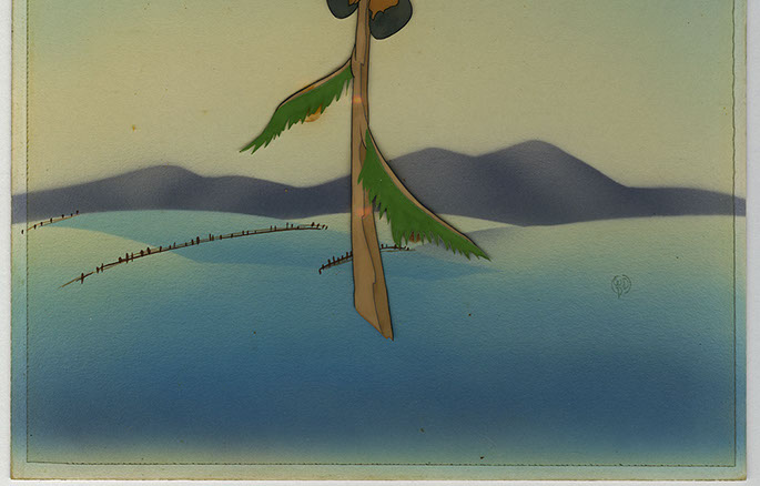 In 1995, Barbagallo published a hypothesis stating that Disney Di-Acetate shrinks about 3/8ths of an inch during a 40 year period. His observation was made in the 1990s by observing the emergence of glue stains around cels that had been adhered to backgrounds. 24 years later, his research proved this to be true. This cel setup of Goofy and Percy from Walt Disney's 1941 feature film The Reluctant Dragon proves that point. (animation shown here is an 18 year time lapse). Images : The Research Library at Animation Art Conservation