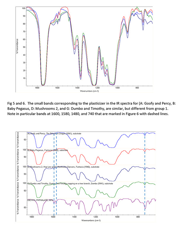 In regard to the seven Disney Di-Acetate samples used in this project, Derrick’s test results revealed that all seven of the cel paintings were primarily composed of Cellulose Di-Acetate. This is whether the cel paintings were art from “The Reluctant Dragon" (1941), or different sequences in “Fantasia" (1940), or “Dumbo” (1941). Closer comparison of the smaller bands in the seven samples indicates that there were two primary plasticizers used in these cels. One group (cels C: Mushrooms 1, E: Goofy and F: Dumbo) are similar and exhibit small bands that best corresponds to the plasticizer Triphenyl Phosphate. The second group of cels (A: Goofy and Percy, B: Baby Pegasus, D: Mushrooms 2, and G: Dumbo and Timothy) are similar to each other and different from group One. The plasticizer that best corresponds to this group is Ethyl Phthalate, although other Phthalates would produce similar bands.