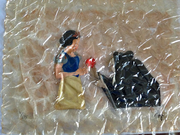 A buoyant plastic at the time it was created, this plastic over the course of the last 32 years has gone from having the quality and timbre of a piece of tin plate ceiling tile to a tightening, brittle plastic with many crisscrossing fissures that can be found throughout this type of plastic. What's causing it? The release of camphor, the plasticizer in this type of plastic. In its final stages, these types of cracks within Snow White art will reduce her substrate to a pile of tiny crystals created by all these overlapping cracks.